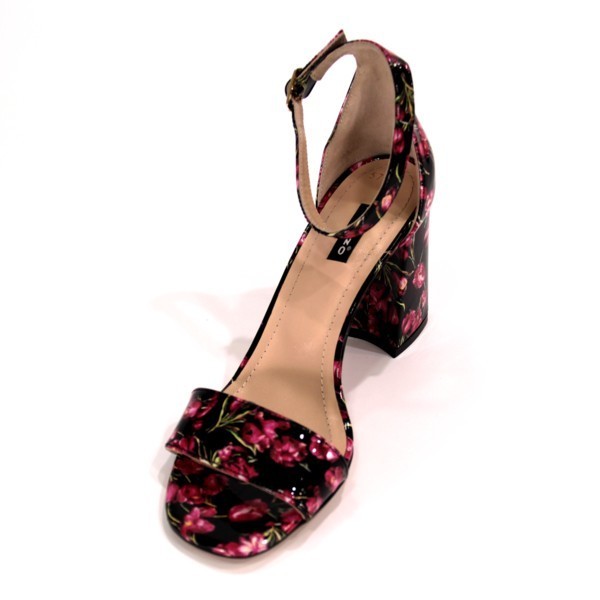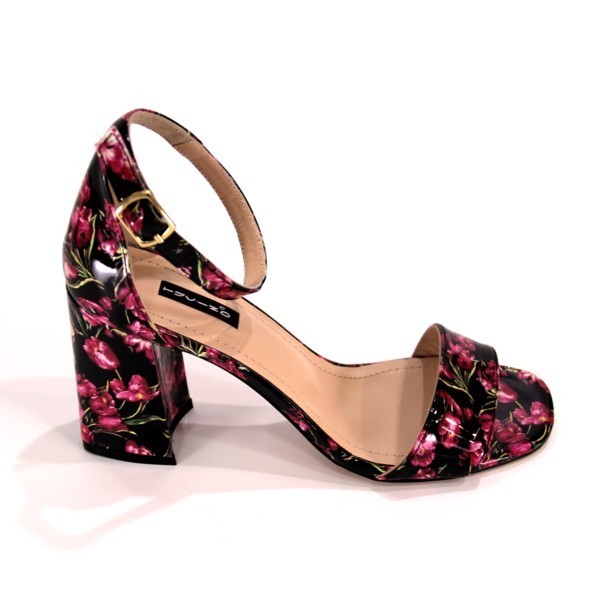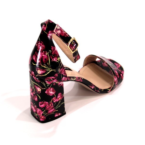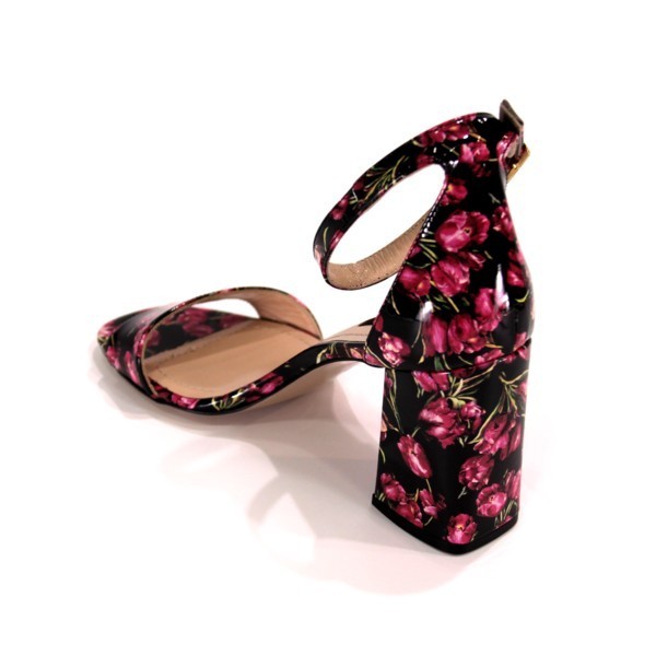 Босоніжки з натуральної лакової шкіри з малюнком з рожевих тюльпанів на стійких підборах.